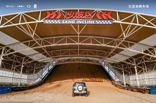 不同于传统赛车场的单一设计,比亚迪将全国特色地形 “搬” 进赛场,打造一站式极致体验。悬天沙坡区以 29.6 米垂直高度和 28° 冲坡落差斩获两项吉尼斯纪录,站在顶部 300 平米观景平台,既能避开极寒极热,又能近距离感受车辆冲坡时的震撼,让城市用户轻松解锁阿拉善冲沙乐趣。