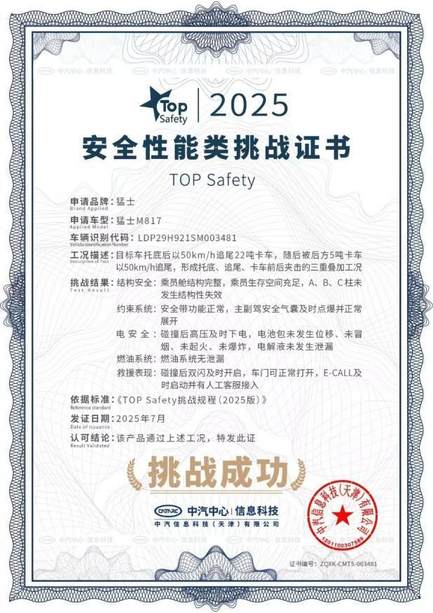 在用户最为关心的电池安全方面,猛士M817搭载宁德时代越野专用电池,采用“9层电池包+1300MPa一体冲压热成型钢板”10层防护,通过10倍国标的机械振动测试、200倍国标的浸水测试、4倍国标的机械冲击测试;智能BMS电池管理系统24小时监测电池健康,提前预警风险,确保越野磕碰、涉水时电池安全;并且通过行业新能源电安全最全面、测试标准最严苛的中汽中心的NESTA六维电安全认证。