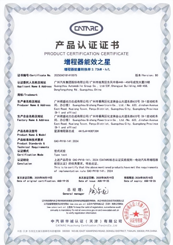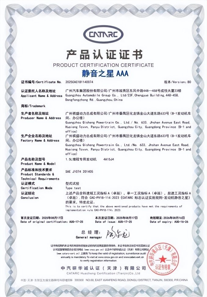 经中汽研认证,广汽星源增程1.5L增程专用发动机荣获最高等级“静音之星AAA”认证