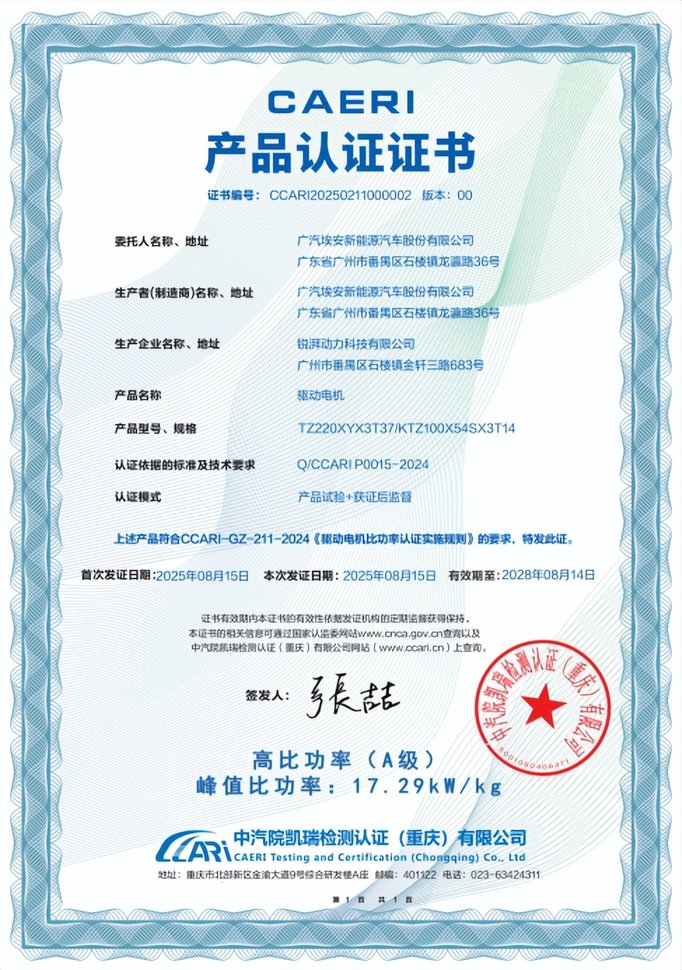 经中国汽研认证,广汽夸克电驱2.0驱动电机功率密度高达17.29kW/kg