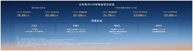 8月23日,吉利银河旗下首款“AI科技大六座旗舰SUV”——吉利银河M9正式开启全球预售,共推出6个版型,分别为210km四驱领航版、230km两驱探索版、230km两驱智航版、100km两驱智航版、以及230km两驱远航版、100km两驱启航版。预售价格为19.38万元——25.88万元。