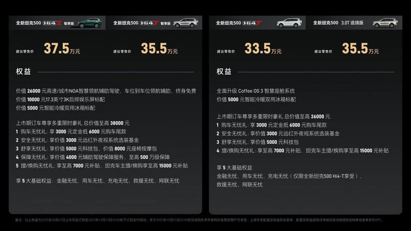 全新坦克500定位全场景智能豪华越野SUV,推出Hi4-Z、Hi4-T及3.0T V6燃油三种动力版本,其中Hi4-Z智享版37.5万元,Hi4-T智享版35.5万元,Hi4-T基础版33.5万元,3.0T造境版35.5万元,相比预售价格更具吸引力。