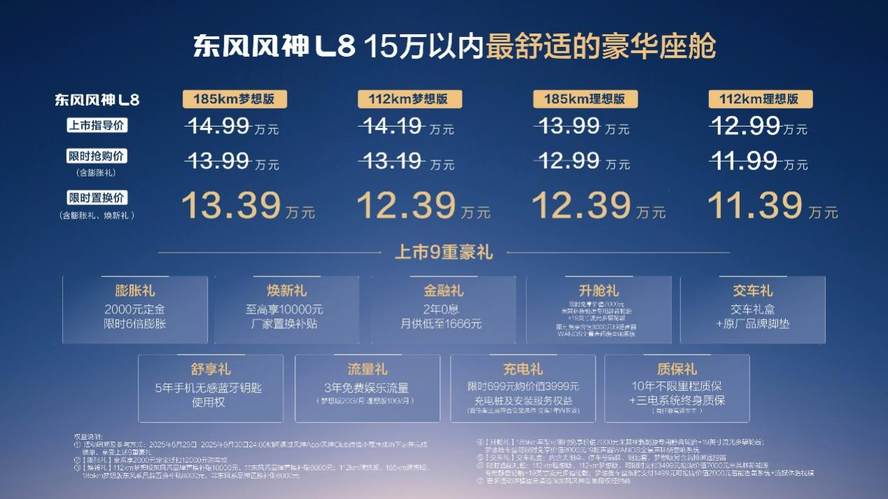 8月29日,在第28届成都车展上,东风新旗舰东风风神L8正式宣布上市,限时置换价仅需11.39万元起(可叠加享受国/地补),直接击穿“25万元才能配齐冰箱彩电大沙发”的行业认知,成为这个级别最具竞争力的舒享座舱之王。