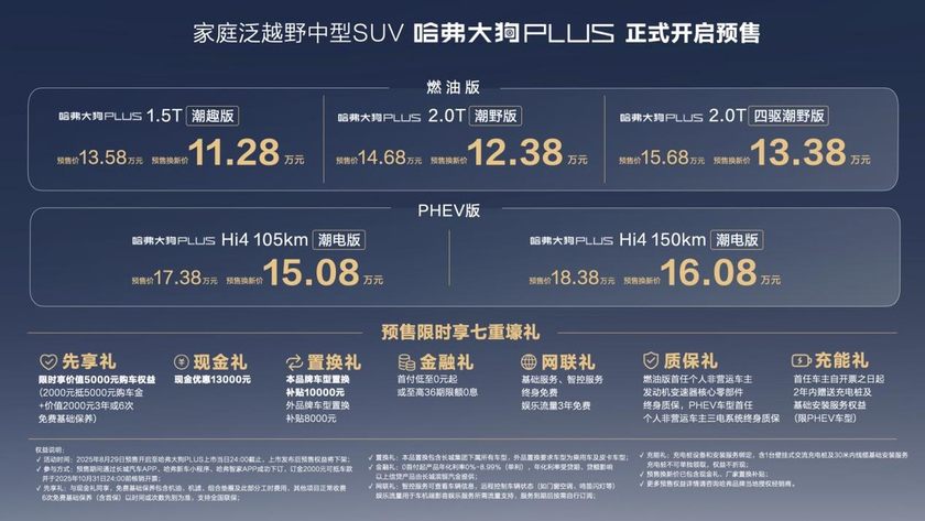 作为哈弗展台的重磅“c位”产品,“为家而来”的哈弗大狗PLUS正式发布预售,现在下订可享受13000元现金优惠,至高10000元置换补贴,预售换新价格11.28万元至16.08万元。其中,哈弗大狗PLUS:1.5T潮趣版11.28万元、2.0T潮野版12.38万元、2.0T四驱潮野版13.38万元。哈弗大狗PLUS PHEV : Hi4 105km潮电版15.08万元、Hi4 150km 潮电版16.08万元。此外,更有先享礼、金融礼、网联礼、质保礼、充能礼可享,包括: