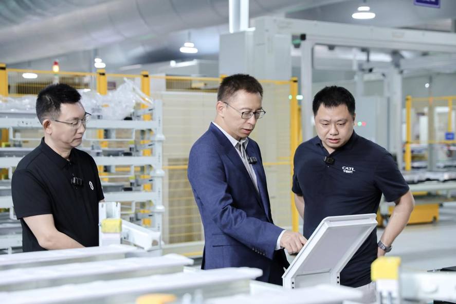 随后,张朝阳走进位于超级工厂内的宁德时代“厂中厂”,探访电池生产的核心环节。宁德时代产品经理刘辉林介绍:“这里主要为问界全系车型提供定制化电池方案,实现电池生产与整车制造的无缝集成。”在这一模式下,电芯运抵“厂中厂”后,经过激光焊接、AI视觉检测等20余道自动化装配和检测工序完成组装,精度高达0.1毫米,确保电池的一致性与安全性。