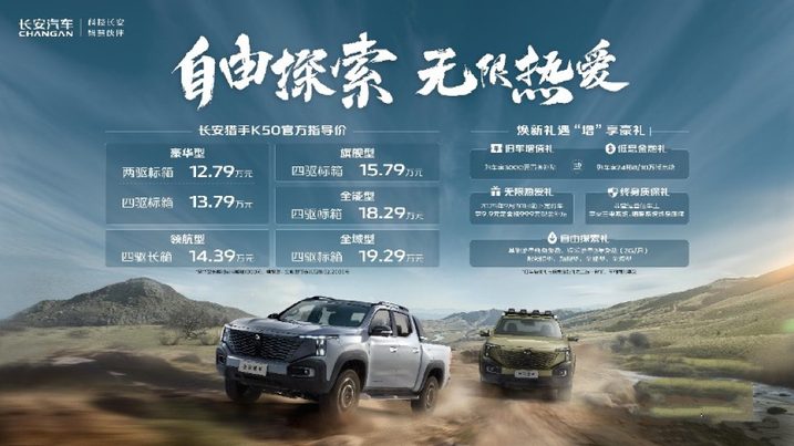 8月29日,长安猎手K50全系上市发布会在成都车展举行。长安猎手K50正式推出豪华型、领航型及旗舰型等6款车型,覆盖两驱与四驱、标箱与长箱多元组合,售价12.79万元起。
