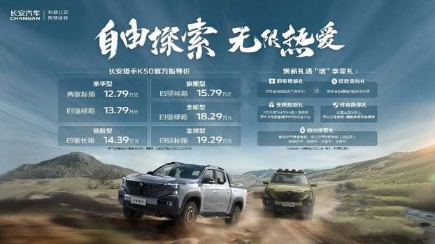 8月29日,“自由探索 无限热爱——长安猎手新价值分享暨K50全系上市发布会”在成都车展举行。长安猎手K50正式推出豪华型、领航型及旗舰型等6款车型,覆盖两驱与四驱、标箱与长箱多元组合,售价12.79万元起,购车即可享受9.9元定金抵999元现金补贴和非营运首任车主享三电系统、增程系统终身质保等多重好礼,以极具竞争力的产品力与诚意价格,助力用户开启全新皮卡生活方式。