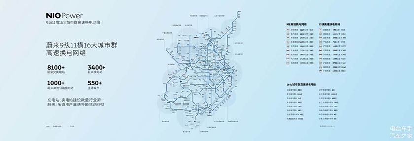 蔚来始终坚持在补能基建上的投入,旨在让加电像加油一样方便,截至8月29日,蔚来已在全国范围累计建成充换电站8,192座,其中换电站3,467座、充电站4,725座,充电桩27050个。并建成1001座高速公路换电站、打通了9纵11横16大城市群高速换电网络,完成全国主要城市间高速公路的换电网络建设,连通全国550多个城市,让蔚来、乐道用户彻底告别高速补能焦虑。