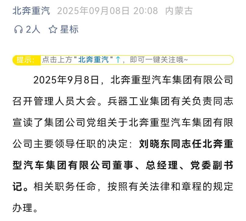 2025年9月8日,搜狐商用车从北奔重汽官方获悉,北奔重汽总经理调整,刘晓东接替洪彰勇成为新任总经理,将和去年11月出任董事长的牟月辉共同领导北奔重汽。
