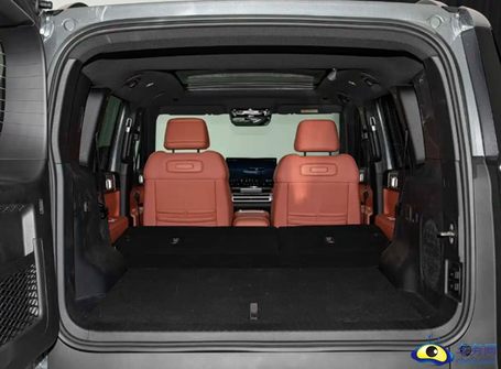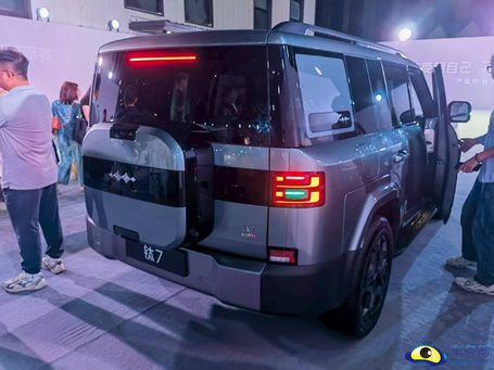 作为方程豹品牌旗下的承载式车身 SUV,钛 7 继续采用硬派 SUV 常见的 “方盒子” 车身轮廓,匹配细节无漆材质的前 / 后保险杠和侧裙。作为前脸的设计特点之一,其前灯组采用双层式设计,点亮后具有双 L 光形。从车身侧面来看,钛 7 配备传统造型车门外拉手和固定式侧踏板,轮眉为车身同色处理,并且 A 柱至 D 柱均采用黑化设计。有意思的是,钛 7 位于 C 柱和 D 柱之间的侧窗为半封闭处理,外部饰板为车身同色。车尾方面,钛 7 尾门提供外挂式 “小书包” 设计,不过其并非备胎,而是小型外挂式储物箱,内部带有置物网。与前灯组风格相似,钛 7 尾灯组内部同样具有双 L 形结构,采用侧开式尾门和隐藏式排气布局。