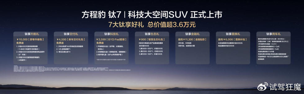 在购车权益上,方程豹更是诚意十足,为首批车主带来了总价值最高超3.6万元的7大钛享好礼!其中包括:覆盖多项座椅舒适配置的总价值10000元舒享升级包、价值3599元的BYD Pad套装、价值4500元的新车交付礼包均免费送;提供3年0息、5年低息、0首付起或至高84期等多重金融方案以供选择,金融贴息最高价值11300元;还有最高价值6000元的置换补贴、价值900元的智慧生态礼包,以及2年5G每个月的免费车机流量、非营运车辆长达6年或15万公里的整车包修、“三电”系统的终身保修、终身免费系统OTA升级等,让每一个家庭都能轻松拥抱钛7,让美好生活触手可及。