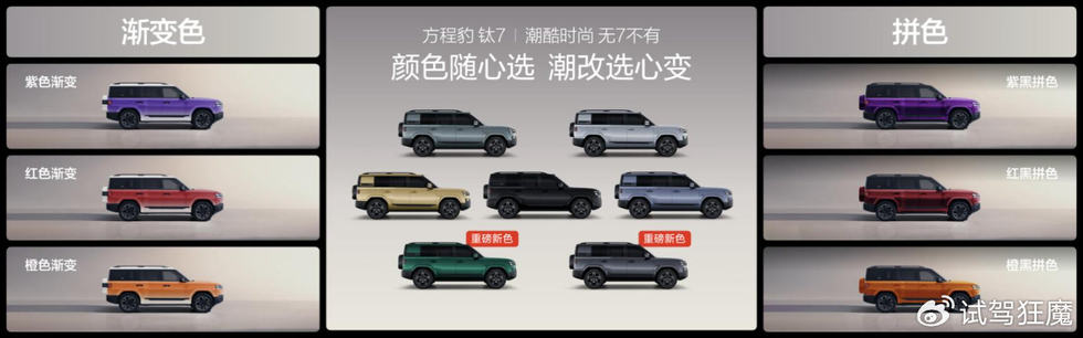 为了让广大用户选得尽兴,钛7直接一步到位,带来了7款外观颜色、3款内饰颜色,同步在官方商城上架了6款潮改方案,可满足不同用户的审美偏好。