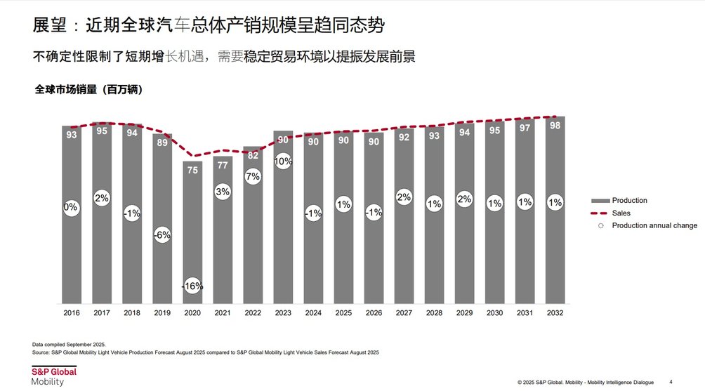 近日,“2025 Mobility Intelligence Dialogue ”系列活动——上海站在上海前滩香格里拉酒店举办,标普全球汽车分析师与汽车产业相关企业嘉宾从“新时代下的汽车行业转型”等十几个主题分享研究成果和展开讨论,标普全球汽车分析师判断,全球汽车市场2028年将达到1%的稳定增长,中国汽车市场在新能源车购置税减免政策退出后,会遭遇负增长,2028年将有3%负增长。标普全球汽车建议,海外市场业务扩张助力中国本土车企重获增长动力。预计到2035年,中国企业可开拓出一个近千万辆级的海外市场。