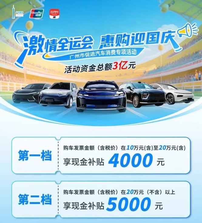 近日,广州市推出“激情全运会 惠购迎国庆”促进汽车消费专项活动。2025年9月15日至30日期间,全国个人消费者只要在广州购买符合条件的小客车新车并开具发票,至高可享受5000元/车补贴。本次活动补贴总额3亿元,实行“先到先得,用完即止”。本次活动旨在进一步释放汽车消费潜力,助力“金九银十”传统销售旺季。