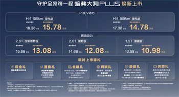动力系统上,哈弗大狗 PLUS 提供燃油与插电混动(PHEV)两种选择。燃油版涵盖 1.5T 和 2.0T 动力组合,匹配 7DCT/9DCT 变速箱,满足不同用户的日常通勤与性能需求。PHEV 版则搭载第二代 Hi4 智能四驱电混技术,由 1.5T 混动专用发动机与前后双电机组成,系统最大功率 272kW,最大扭矩 750N・m,百公里加速仅需 6.2 秒,同时 WLTC 馈电油耗低至 5.99L/100km,满油满电综合续航超 1000km,兼顾动力与能效。