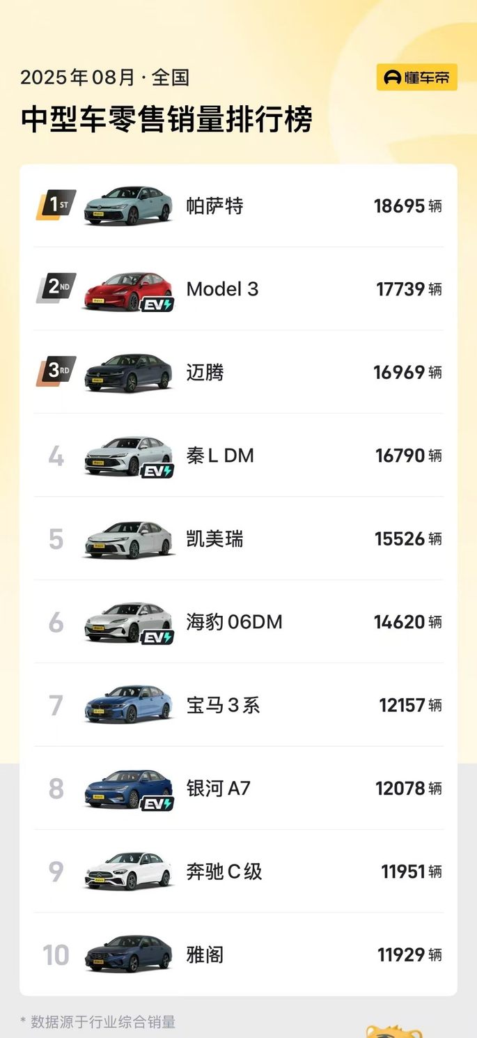 在中型车市场,帕萨特家族的表现同样亮眼。8月近1.9万辆的销量不仅让其登顶合资中型轿车榜首,更拿下B级燃油车年度累计销冠。帕萨特的成功,在于它打破了“商务车=刻板”的认知:2025出众款以15.99万元的起售价抢占性价比赛道,Pro版则通过“奢享升舱包”提供座椅加热、哈曼卡顿音响等豪华配置,堪称“中高级轿车的破圈范本”。