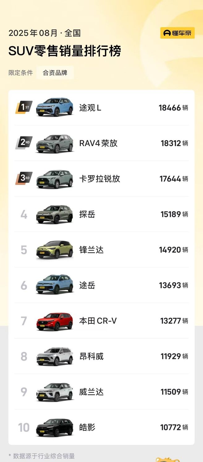 途岳家族作为SUV入门之选,7.99万元的起售价和80万+车主的口碑背书,让其在紧凑SUV市场站稳脚跟,8月13693辆的销量印证了“亲民定位”的正确性。