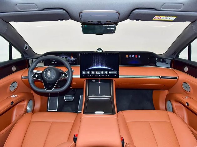 车内采用全新寰宇座舱设计,提供四款内饰色的组合,采用Nappa真皮、进口实木、麂皮顶材质,加上1680万全色域流水氛围灯和星环散射体,让整个座舱既豪华又温暖。且该车还搭载了16.1英寸中控屏+12.3英寸液晶仪表盘+12.3英寸副驾娱乐屏,车机内置鸿蒙智能座舱4.0,支持多屏联动与无缝生态互联。可选装的智能投影巨幕系统2.0(支持1080P超清画质,语音控制)进一步提升了后排的娱乐体验,打造“移动影院”。全车配备9块双层静音夹胶玻璃、300+处静音设计,打造出“超越百万豪车的NVH水平”。