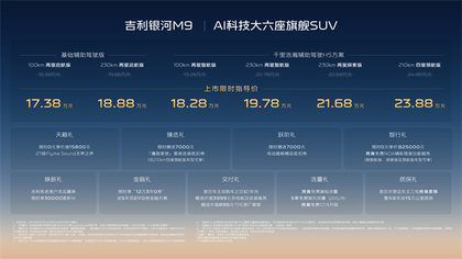 吉利银河M9共推出6款配置车型,分别为210km四驱领航版、230km两驱探索版、230km两驱智航版、100km两驱智航版、以及230km两驱远航版、100km两驱启航版,叠加限时超级置换金10000元权益后,上市限时指导价为17.38万元-23.88万元。