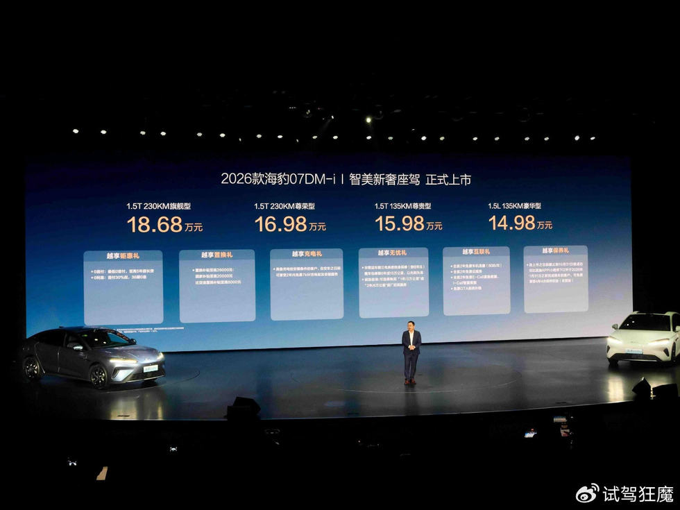 2025年9月15日,比亚迪2026款海豹07DM-i正式上市。这款定位“智美新奢座驾”的插电混动轿车,以14.98-18.68万元的价格区间,推出了四款配置车型。