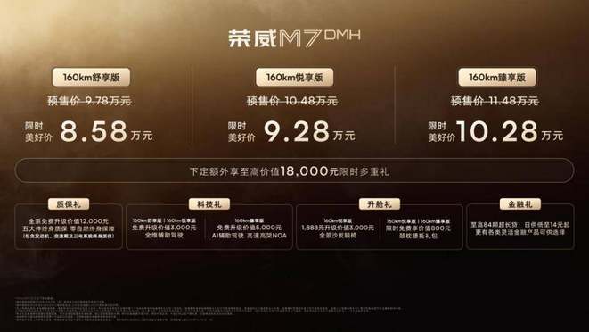 2025年9月21日,长续航中大型豪华轿车——荣威M7 DMH华中区上市品鉴会武汉站在武汉江宸天街盛大启幕。新车共推出160km舒享版、160km悦享版、160km臻享版3款车型,官方指导价9.78万元-11.48万元;即日起至10月31日(含)前完成大定并锁单的用户,可享限时美好价8.58万元-10.28万元,现在下定更可尊享至高价值18,000元限时四重礼,包含“五大件终身质保”、“零自燃终身保障”等多重专属购车权益。