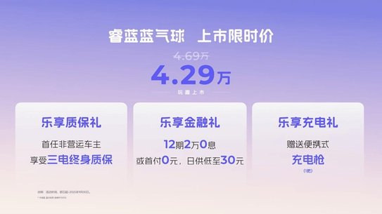 同时,睿蓝蓝气球在上市之际也推出多重惊喜好礼,涵盖首任非营运车主享受三电终身质保、12期2万0息或首付0元,日供低至30元金融礼、赠送1把便携式充电枪,进一步减轻用户拥车压力。即日起,消费者可通过睿蓝汽车官方APP、小程序或授权经销商渠道了解详情、预约试驾,并可享首批车主专属礼遇。