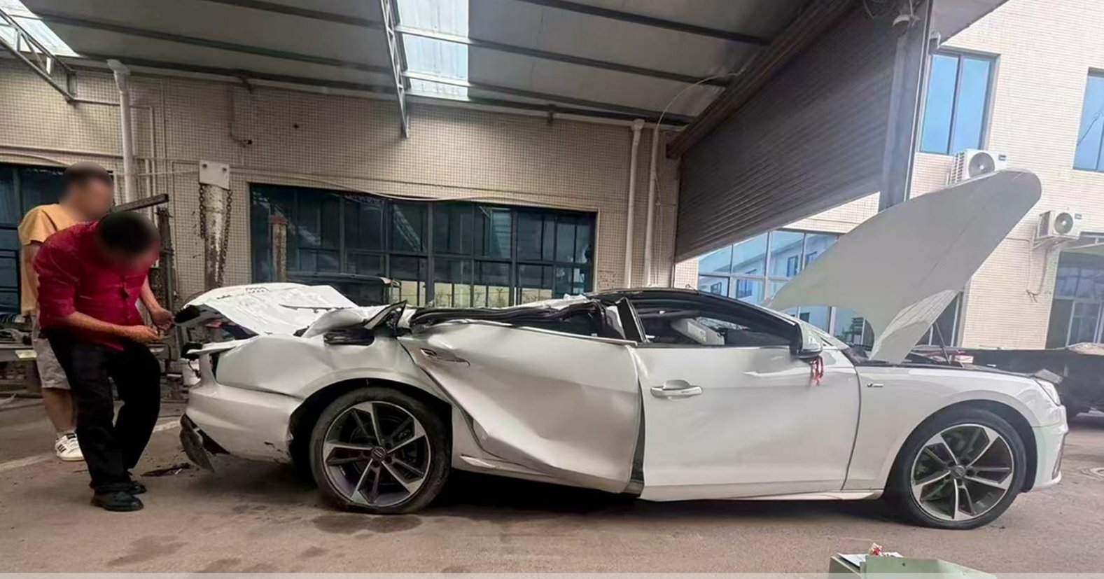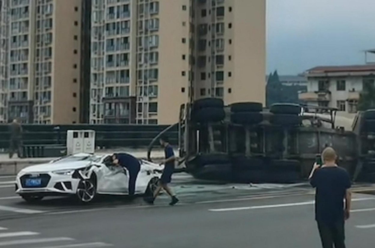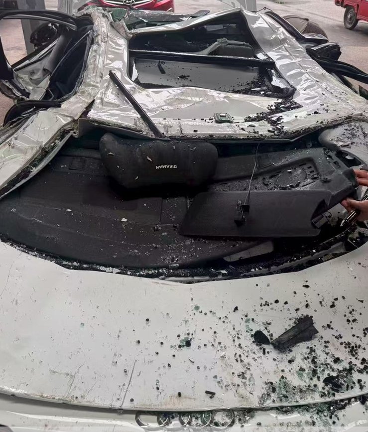 没人能预料到下一秒的危险。一辆满载水泥的罐车在过弯时突然失控侧翻,40 余吨的车身裹挟着碎石与粉尘,如同庞然大物般砸向李先生的 A4L。“当时只听见‘轰隆’一声巨响,整个车都被压得往下沉,我脑子里一片空白,只想着‘完了’。” 事后回忆起那一幕,李先生的声音仍带着一丝颤抖,但更多的是庆幸,“等我反应过来,试着推车门,居然能推开!除了胳膊有点擦伤,身上一点大事都没有。”