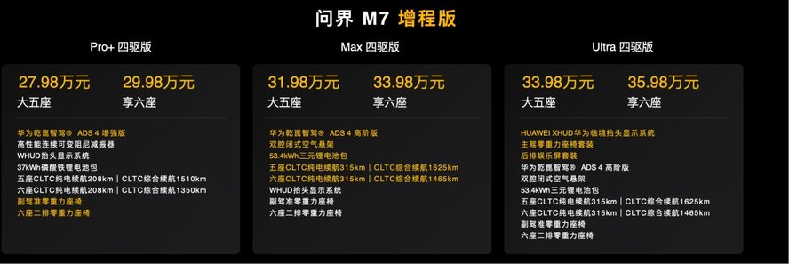 全新问界M7增程版建议零售价为:问界M7增程Pro+大五座四驱版27.98万元起,增程Pro+享六座四驱版29.98万元起;增程Max大五座四驱版31.98万元起,增程Max享六座四驱版33.98万元起;增程Ultra大五座四驱版33.98万元起,增程Ultra享六座四驱版35.98万元起。