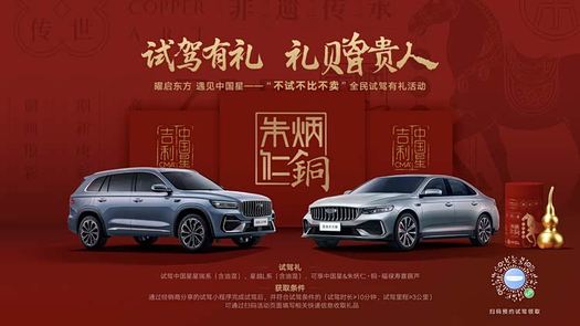 即日起至12月31日,购中国星星瑞、星越L全系,每月在第三方监督公证下抽300名幸运用户,免费赠东方曜限量定制MEIZU 22手机。同时,吉利中国星联合朱炳仁·铜开展“试驾有礼”活动,到店试驾即赠【福禄寿喜葫芦挂件】一份