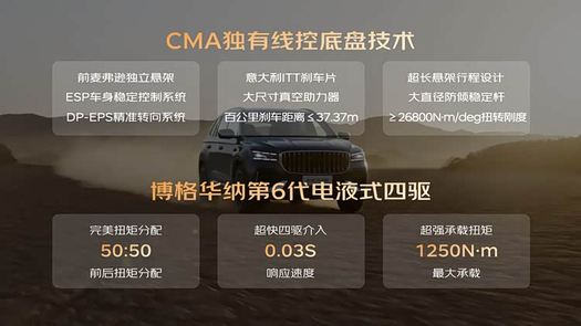 动力性能上,全新东方曜系列全系搭载2.0TD高功率大涡轮发动机+爱信8AT黄金动力总成,最大功率200kW,峰值扭矩400N·m。星瑞东方曜零百加速仅需6.5秒,星越L东方曜为7.3秒,性能提升14%,让高性能不再为豪华品牌专属。基于CMA线控底盘打造,配备四轮独立悬架、运动负外倾角设计及大直径防倾稳定杆,星越L东方曜更搭载博格华纳第六代电液式四驱系统,实现50:50扭矩分配,0.03秒极速响应,无惧湿滑雨雪或旷野非铺装路面。