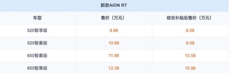 2026款埃安RT的四款配置分别是官方售价为9.98万元的520智享版、官方售价为10.98万元的520智豪版、官方售价为11.98万元的650智豪版、官方售价为12.98万元的650 智尊版。