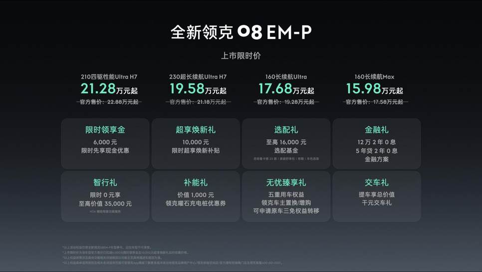 9月24日,全新领克08 EM-P上市。新车提供160长续航Max、160长续航Ultra、230超长续航Ultra H7、210四驱性能Ultra H7四款车型可选,官方限时价15.98万元-21.28万元。