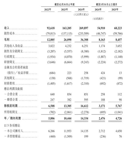 从2月首次递表,到8月获证监会备案、更新招股材料,再到9月初快速通过聆讯,奇瑞的IPO进程推进迅速。支撑这一速度的,是近年亮眼的财务表现:2022至2024年间,营业收入自926亿元跃升至近2700亿元,年复合增长率超70%;净利润也从58亿元增至143亿元,复合增长率达57%。2025年第一季度,公司继续保持增长态势,实现营收682亿元,净利润同比大幅增长90.9%。