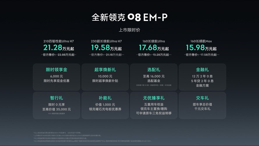 2025 年 9 月 24 日,全新领克 08 EM-P 在上海正式上市,以 “家庭豪华智混 SUV” 定位带来 4 款车型,官方指导价 17.58-22.88 万元,10 月 31 日前购车可享 15.98-21.28 万元限时价及 8 重福利。