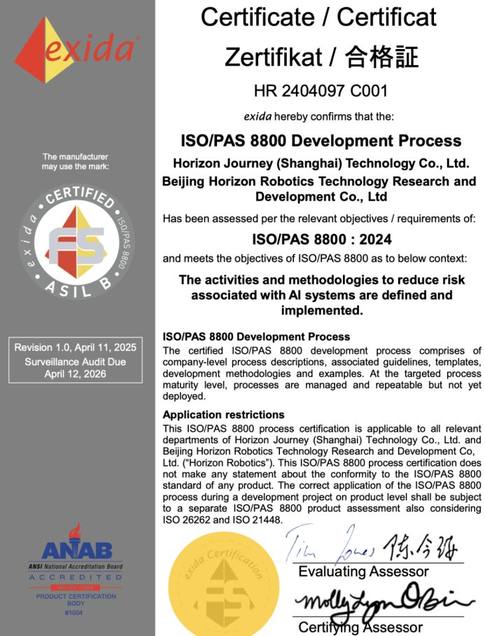 地平线荣获全球首张且唯一的ISO 8800道路车辆AI功能安全认证