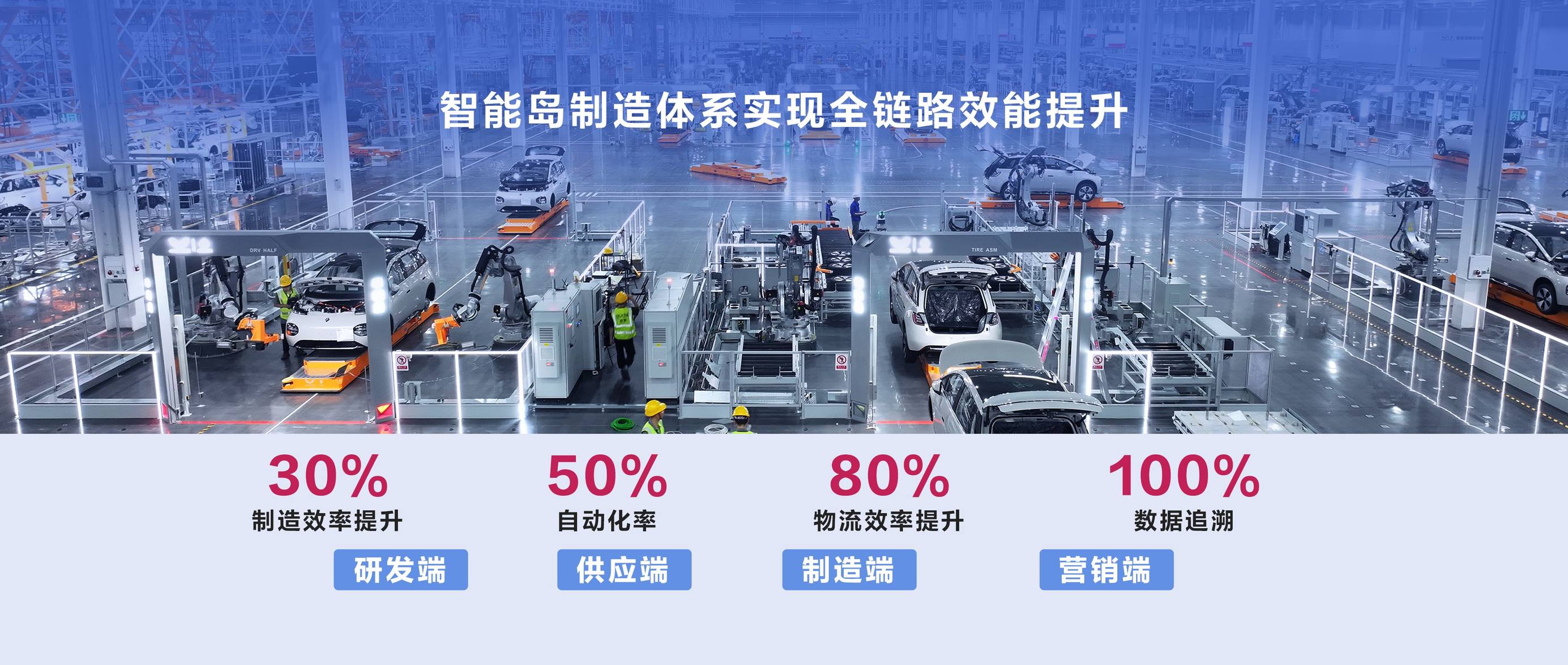 目前,智能岛制造体系(I²MS)总装自动化率达到行业领先的50%,支持20多种不同车型共线生产,生产效率提升30%、物流效率提升80%、制造周期缩短33%,全面刷新行业生产运营核心指标。