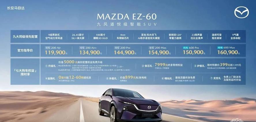 9月26日,九风道悦级智能SUV—长安马自达MAZDA EZ-60(以下称EZ-60)正式上市,作为马自达品牌首款全球战略级新能源SUV车型,新车推出纯电、增程两大动力版本共6款车型、7款颜色,官方指导价区间为11.99万元-16.09万元。