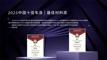 安全是马自达刻在骨子里的DNA,是所有驾乘愉悦的前提。EZ-60通过“实战测试+权威认证”双维度,树立了新能源中型SUV安全领域的新标杆,为用户的每一次出行保驾护航。9月,EZ-60在“勇士之路”丙察察成功完成行业首个“整车碰撞/翻滚/浸水”连环挑战,并荣获中汽中心颁发的“TOP Safety”顶级安全证书,展现出卓越的安全性能。同月再次斩获“2025中国十佳车身”及“最佳材料奖”两项大奖。