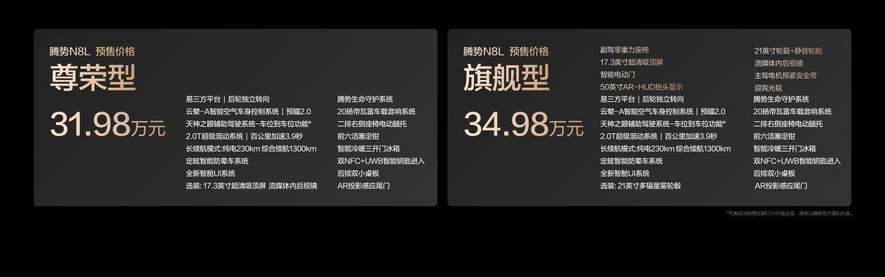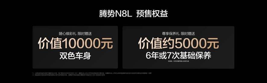 9月26日,腾势N8L正式开启预售,预售价为31.98万元起,旨在打造全家三代人的满意之选,作为腾势品牌旗舰豪华双子星矩阵的重要成员,N8L定位“大六座安全豪华SUV”。目前新车开启限时预购活动,立即预订可享万元专属礼遇,包括价值10000元的双色车身焕彩礼以及价值5000元的基础保养。