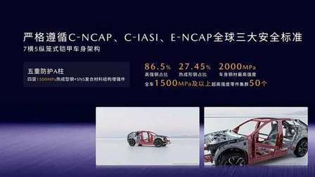 卓越的碰撞成绩来自于车身结构的创新。EZ-60采用7横5纵的笼式铠甲结构,高强钢占比86.5%,热成形钢27.45%,最高强度2000MPa,全车1500MPa及以上超高强度零件集群50个,关键部位更是层层加码,如A柱采用五重防护结构,内外双层1500MPa热成型钢和腔体SNS复合材料,大幅增强A柱的钣金强度和刚度,抗弯性能提升44%。