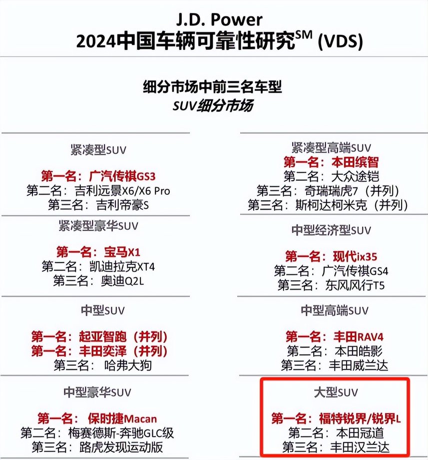 在2025年公布的J.D. Power 2024中国车辆可靠性研究SM(VDS)中,福特锐界L获得大型SUV可靠性第一名。在车辆实际出行体验上,第一批福特锐界L混动版车主有的行驶里程已超10万公里,行车足迹遍布中国大陆所有省份的各种地形地貌,经过10万公里的考验,福特锐界L各项功能正常稳定工作,实测总行程平均百公里油耗7.66L、每公里油费不到5毛9。刹车片、火花塞等磨损微小,平均每万公里保养费用不到360元,展现出福特锐界L的扎实制造水准和耐久性品质。