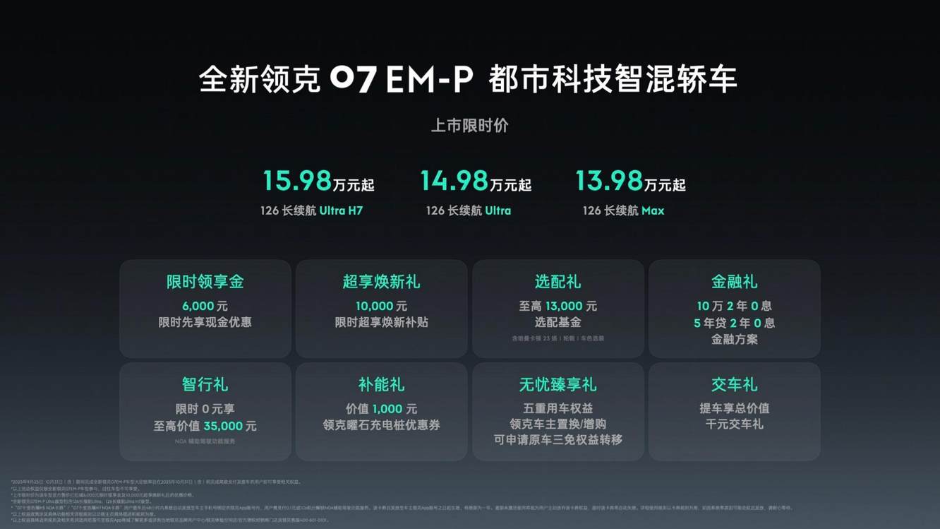 全新有为,极智新境。9月25日,都市科技智混轿车——全新领克07 EM-P正式上市。新车共推出126长续航Max、126长续航Ultra、126长续航Ultra H7三款配置版本,上市限时价13.98万元起。同时,全新领克07 EM-P还准备了限时领享金、超享焕新礼、选配礼、金融礼、智行礼、补能礼、无忧臻享礼、交车礼在内的8重限时福利。