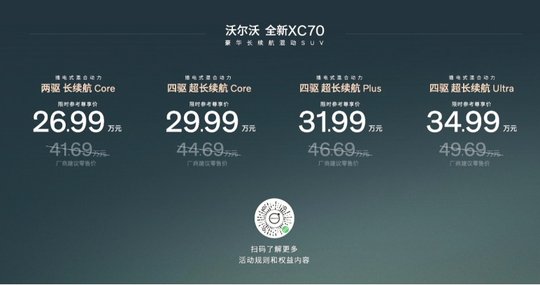 价格与配置的精准配比,是全新XC70引爆订单的核心密码。此次推出的4款车型覆盖多元需求:26.99万元的两驱长续航Core版满足日常通勤;顶配四驱超长续航Ultra版以34.99万元提供豪华满配,叠加置换补贴、金融贴息等价值超6万元的限时权益,性价比优势显著。一位现场订车的先生坦言:“这个价格能买到沃尔沃的安全技术和超混动力,完全超出预期。”