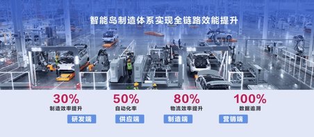 目前,智能岛制造体系(I²MS)总装自动化率达到行业领先的50%,支持20多种不同车型共线生产,生产效率提升30%、物流效率提升80%、制造周期缩短33%,全面刷新行业生产运营核心指标。