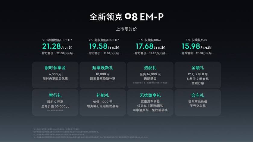 近日,“家庭豪华智混SUV”全新领克08 EM-P正式上市。新车提供160长续航Max、160长续航Ultra、230超长续航Ultra H7、210四驱性能Ultra H7四款车型可选,官方限时价15.98万元-21.28万元。同时,伴随新车上市还有限时领享金、超享焕新礼、选配礼、金融礼、智行礼、补能礼、无忧臻享礼、交车礼在内的8重限时福利。