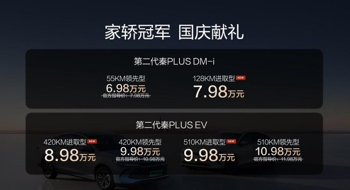 当A级家轿市场仍被“低价必减配”“新能源高门槛”的惯性思维束缚时,比亚迪第二代秦PLUS的上新,以“全系限时6.98万元起”的定价与“续航、油耗、配置三重升级”的组合拳,打破了行业固有格局。这款累销超150万辆、蝉联2023-2024年度家轿销量冠军的“国民车”,此次推出秦 PLUS DM-i 128KM 进取型、秦PLUS EV 420KM/510KM进取型三款新车,重新定义了 A 级家轿的价值标准。