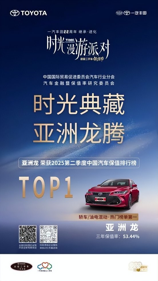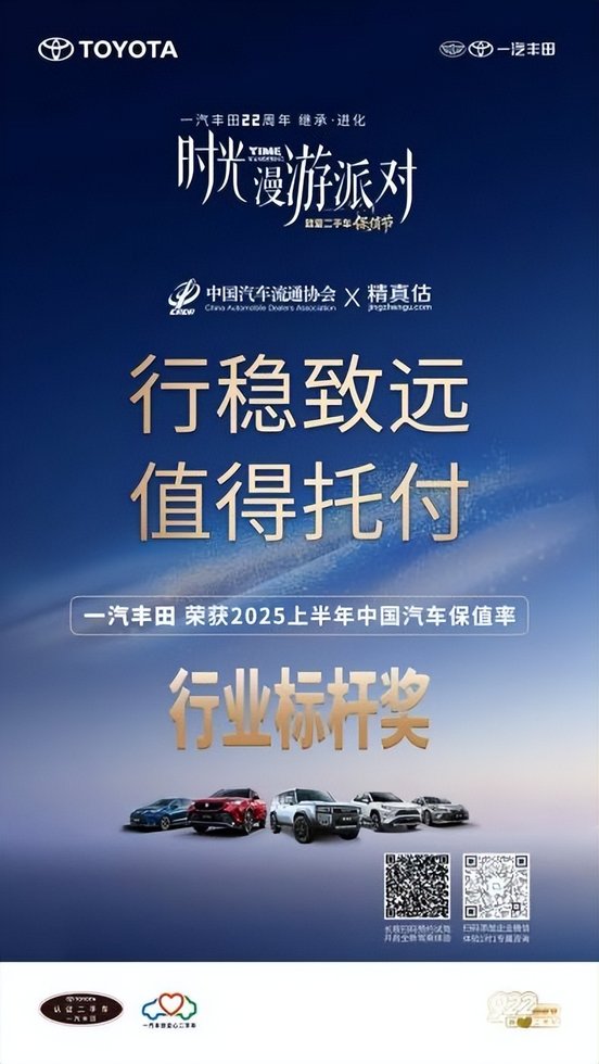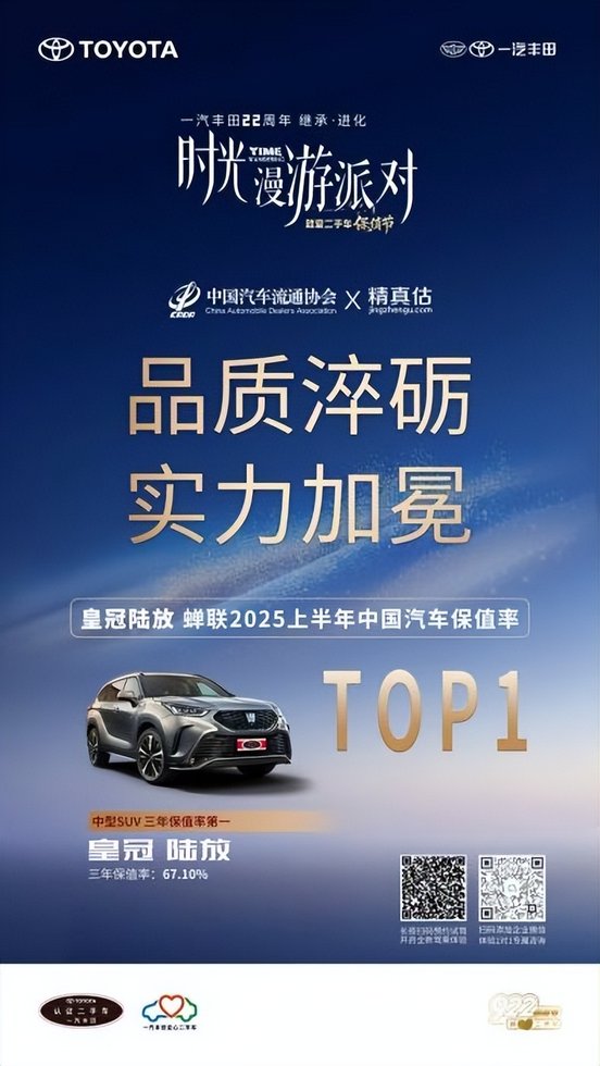 在中国汽车流通协会2025年上半年发布的保值率榜单中,一汽丰田荣获“中国汽车保值率行业标杆奖”。具体到车型,皇冠陆放在中型SUV保值率榜单中高居榜首,三年保值率达67.1%;亚洲龙则持续领跑中高级轿车及混动市场。