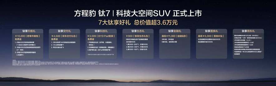 在购车权益上,方程豹更是诚意十足,新车共推出4个配置版本,售价17.98万元-21.98万元,款款越级,款款超值,下单即刻享受最高价值超3.6万元的上市权益,让每一个家庭都能轻松拥抱钛7,让美好生活触手可及。