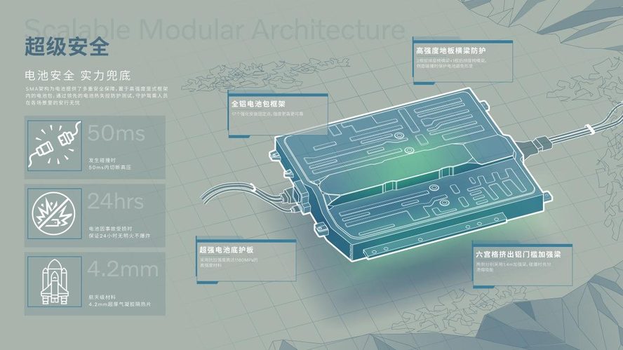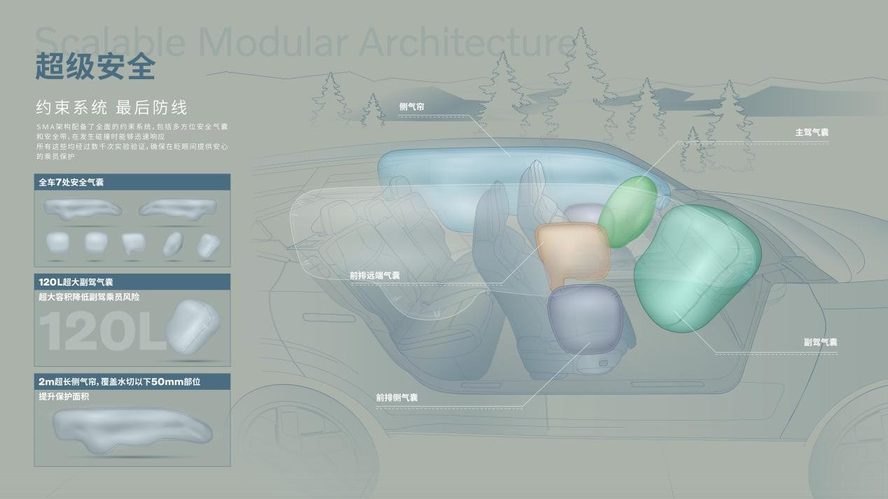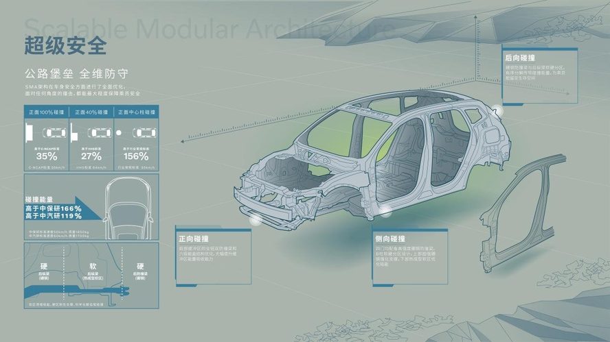 SMA 架构从根上就硬:车身是硼钢笼式结构,“三路三区”吸能 —— 正面撞了冲击力沿上中下三条路缓冲,硼钢“保护区”和全铝双防撞梁 + 6 个吸能盒死死守住娃和老人的“生命空间”。
