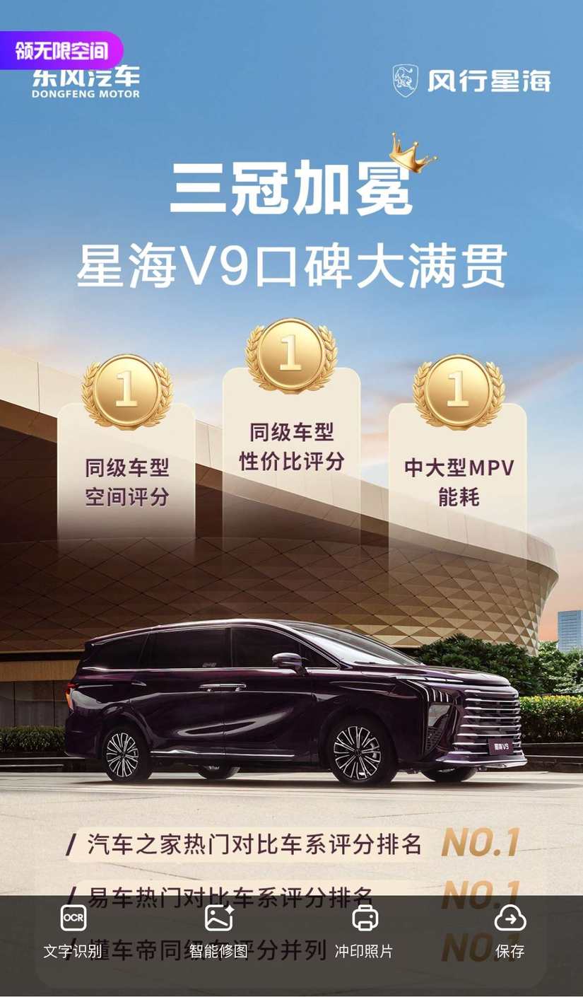 近日,中国汽车市场传来令人振奋的消息——风行星海V9凭借卓越产品实力,一举斩获20万内中大型新能源MPV销量第一、15-20万国产MPV汽车之家关注度第一的佳绩,更同时登顶汽车之家、易车、懂车帝三大权威平台MPV口碑榜榜首,实现口碑“大满贯”。这款专为中国年轻家庭打造的全能MPV,正以实力重新定义“国民好车”的标准。